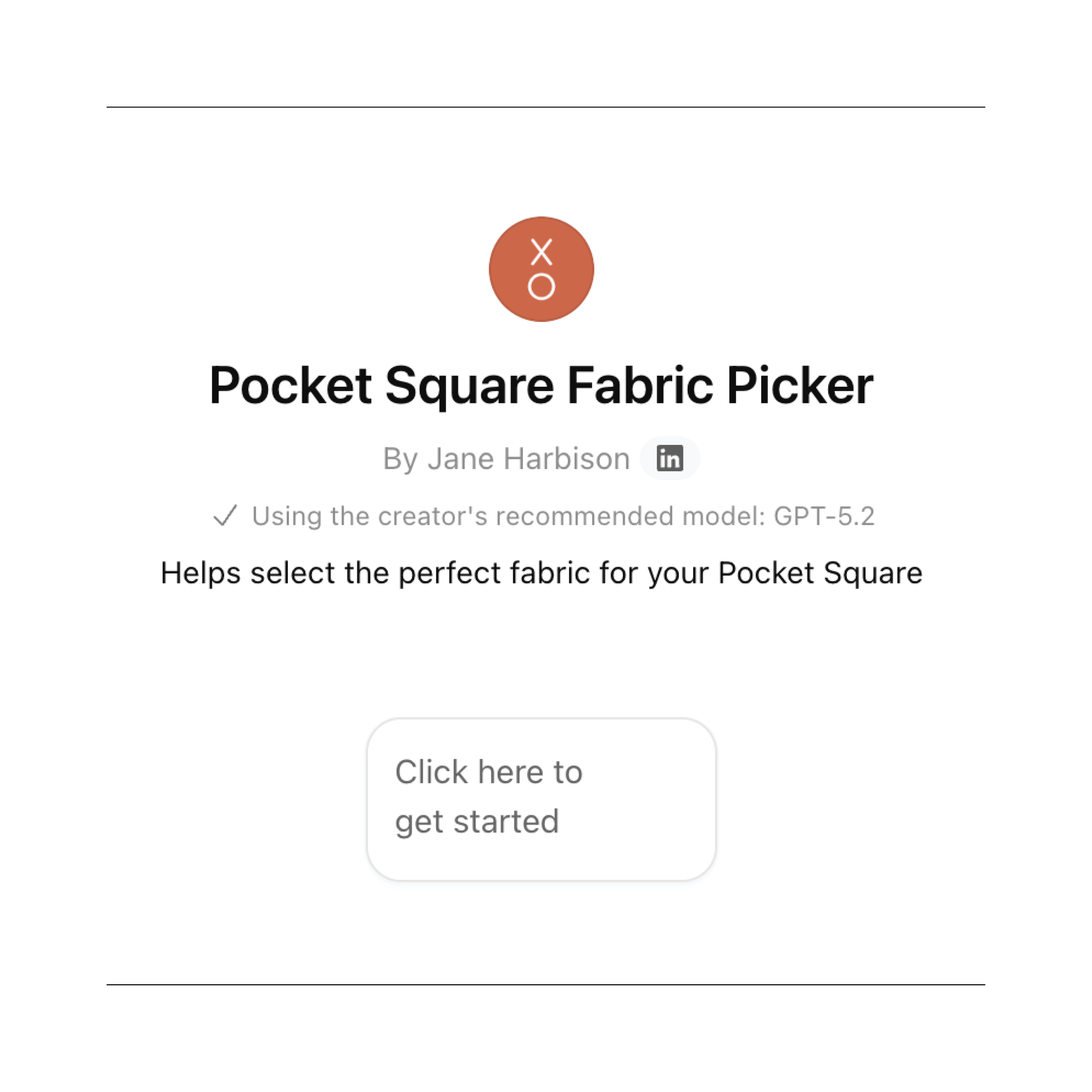 The Pocket Square Fabric Picker works like a simple conversation. You click the link, answer a few multiple-choice questions, and it gives you three fabric recommendations instantly.